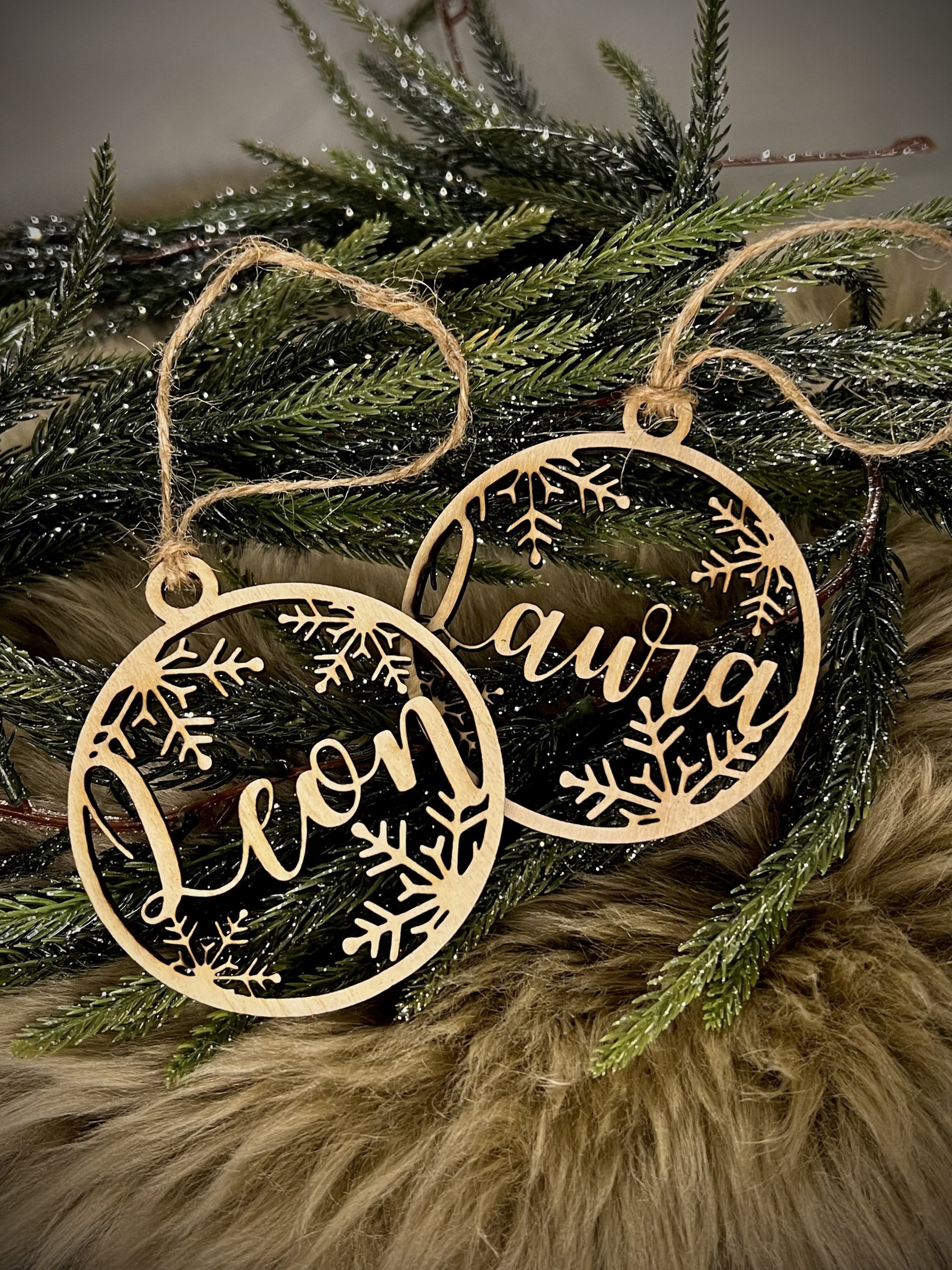 Entdecken Sie die zauberhafte Welt unseres handgefertigten Holzbaumschmucks! Jedes Stück ist kunstvoll gestaltet mit detailreichen Schneeflocken-Ausschnitten, die den Charme des Winters einfangen. Das Besondere: Sie können Ihren persönlichen Touch hinzufügen, indem Sie einen gewünschten Namen eingravieren lassen. Jeder Name wird perfekt in das Design integriert, wodurch jedes Ornament zu einem individuellen Kunstwerk wird.Das natürliche Holz erhält durch die Schneeflocken-Ausschnitte eine besonders stimmungsvolle Note, und das dazu passende Band zum Aufhängen ergänzt die Holzoptik perfekt. Bringen Sie mit unserem einzigartigen, selbstgemachten Baumschmuck Wärme und Persönlichkeit in Ihren festlich geschmückten Weihnachtsbaum.