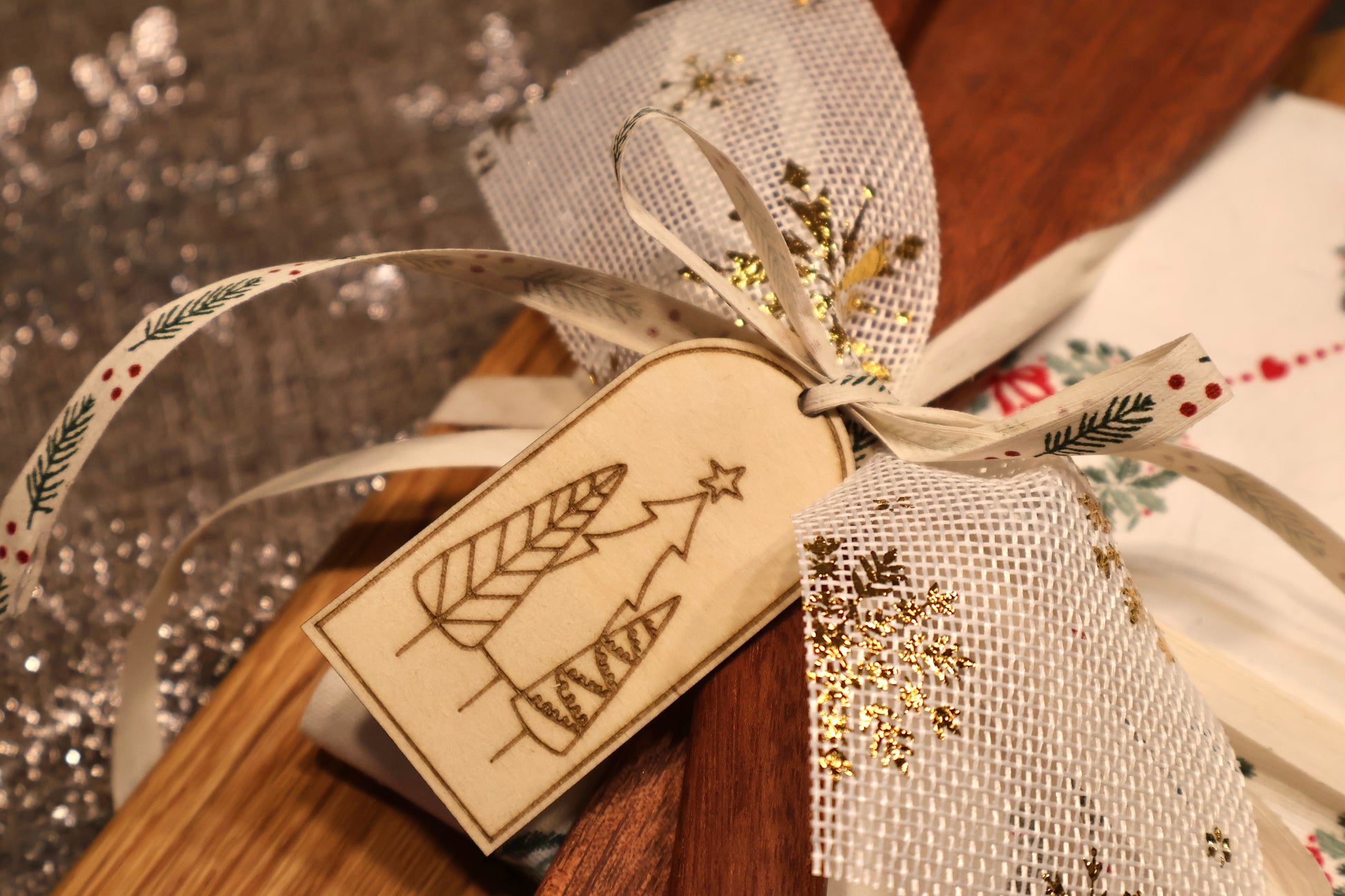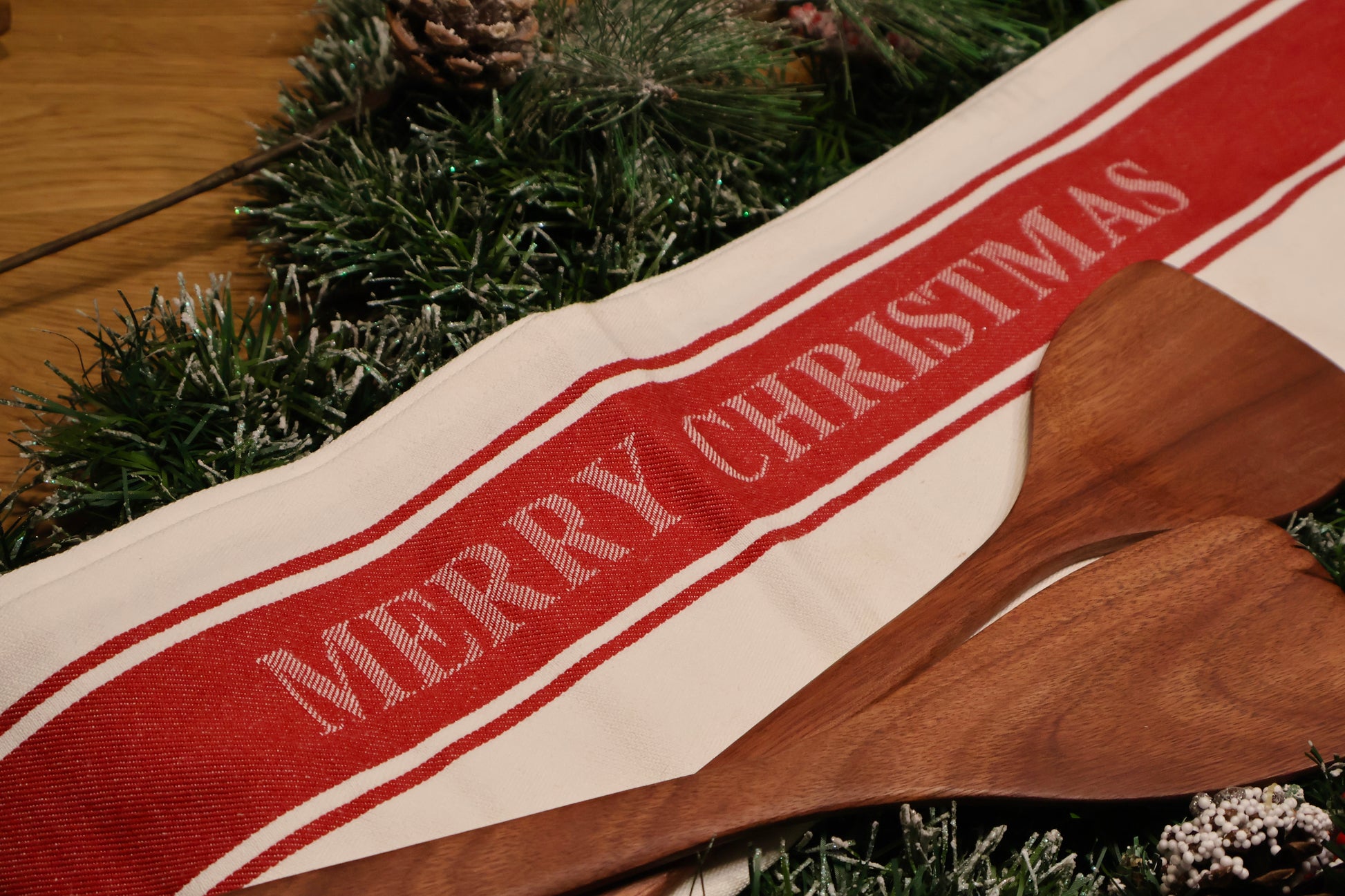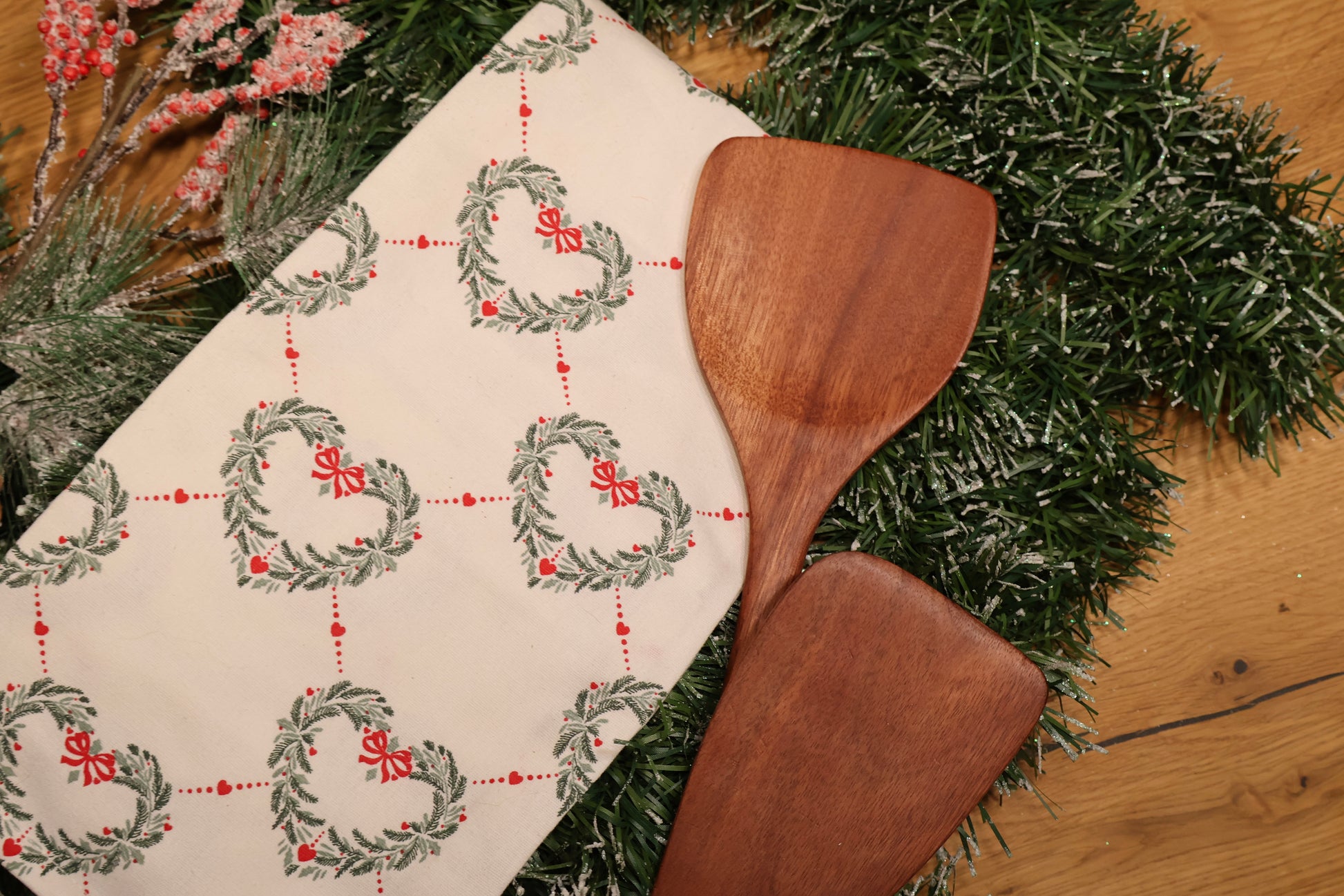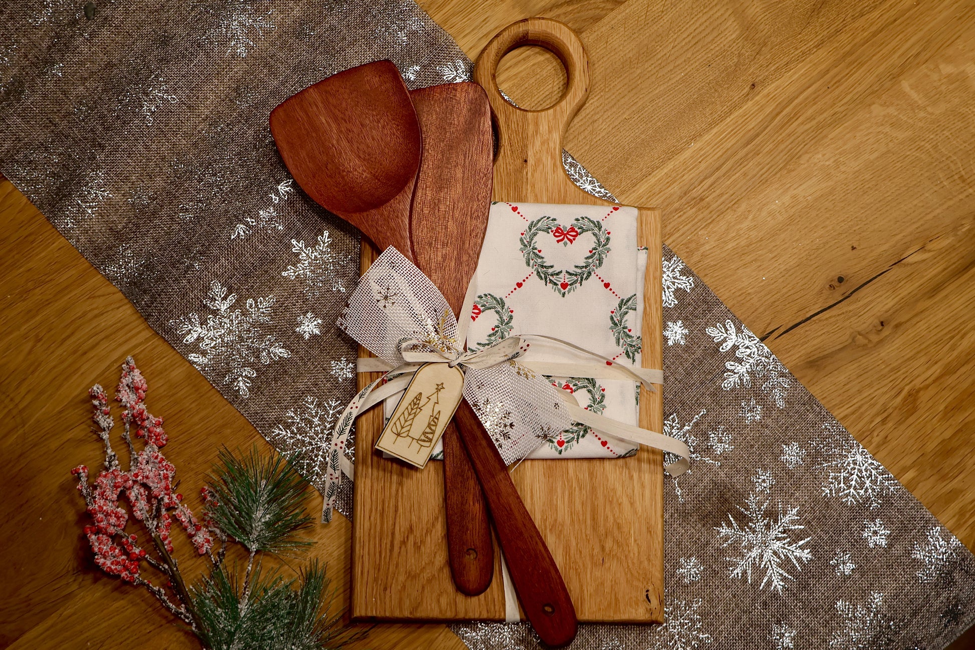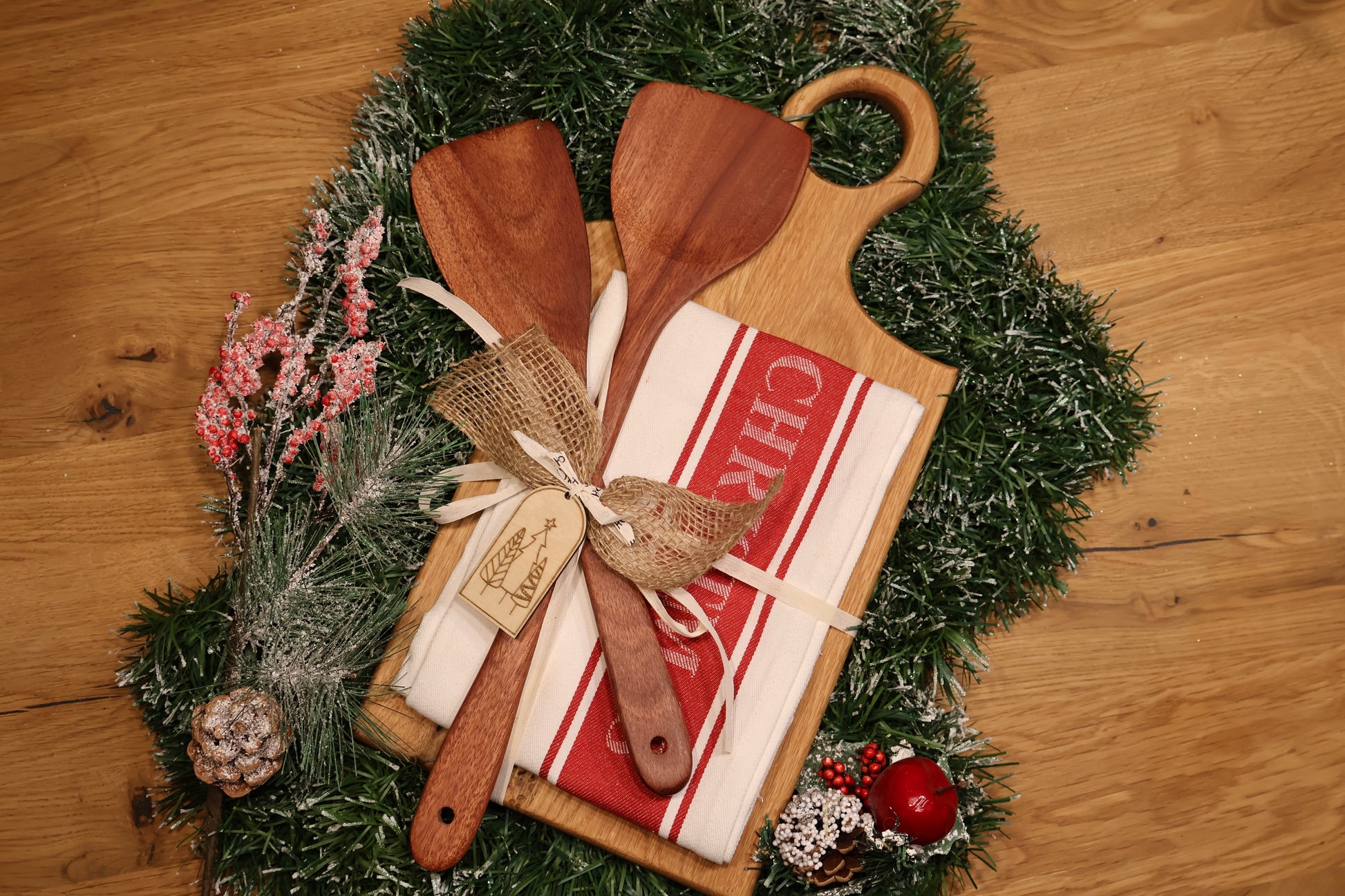 Charmantes Küchen-Set zum Verschenken oder Selbstbehalten: geöltes Eichenbrett mit Griff, zwei handliche Holzspatel und ein festliches Geschirrtuch (Design wählbar: Kranz-Herzen oder Merry Christmas). Ideal zum Servieren, Kochen und Dekorieren – sofort fertig verpackt.
