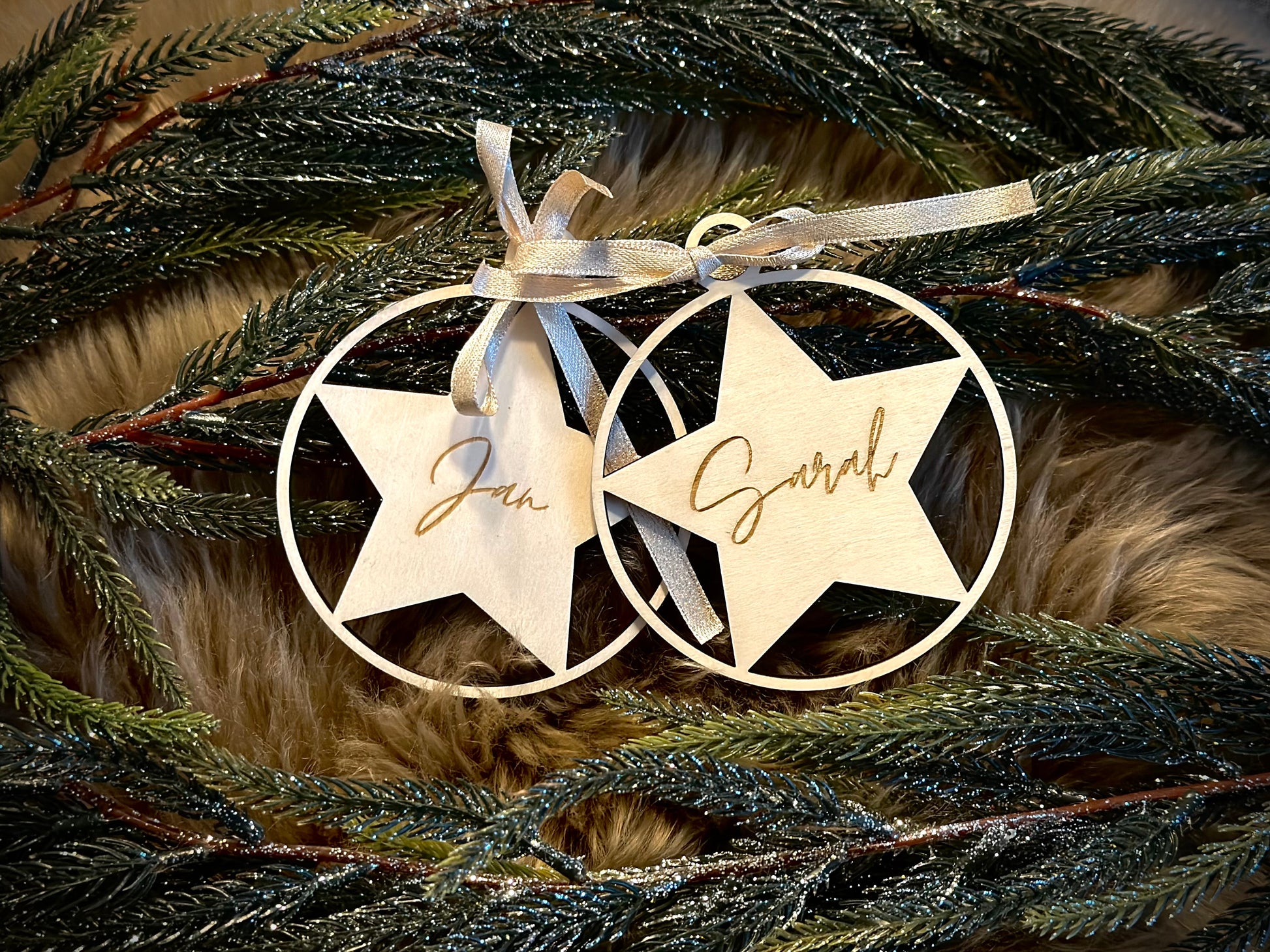 Individueller Baumschmuck aus Pappelholz – Stern mit eingraviertem Wunschnamen