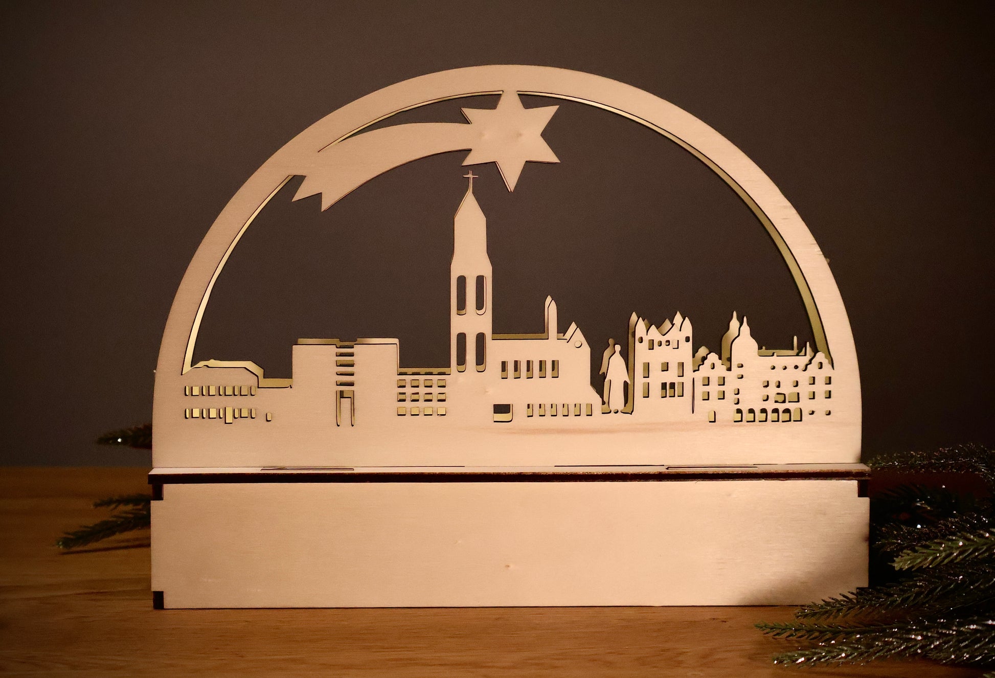 Bringe festlichen Glanz in dein Zuhause mit unserer Lichterdeko Kerpen aus hochwertigem Pappelholz. Die winterliche Szenerie mit feinen, ausgestanzten Details wird von einer integrierten Lichterkette stimmungsvoll beleuchtet und sorgt für eine warme, ruhige Weihnachtsatmosphäre.