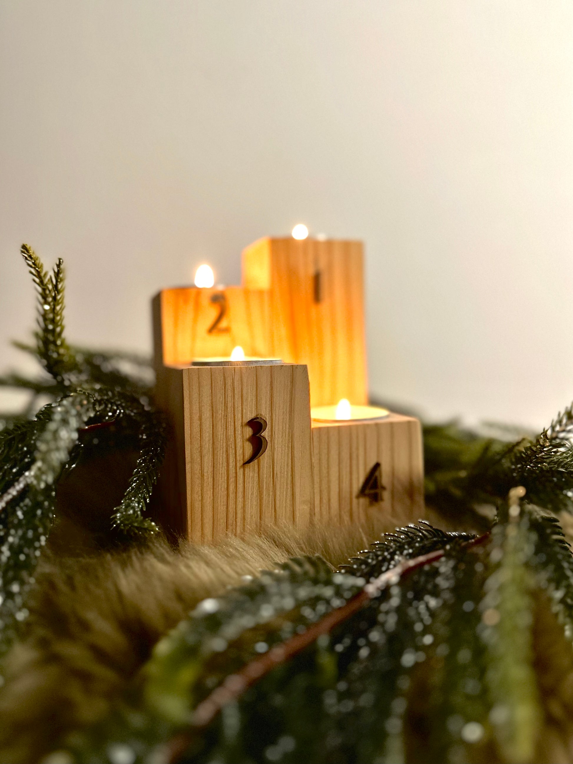 Minimalistischer Adventskranz aus Fichtenholz mit Nussbaum-Zahlen