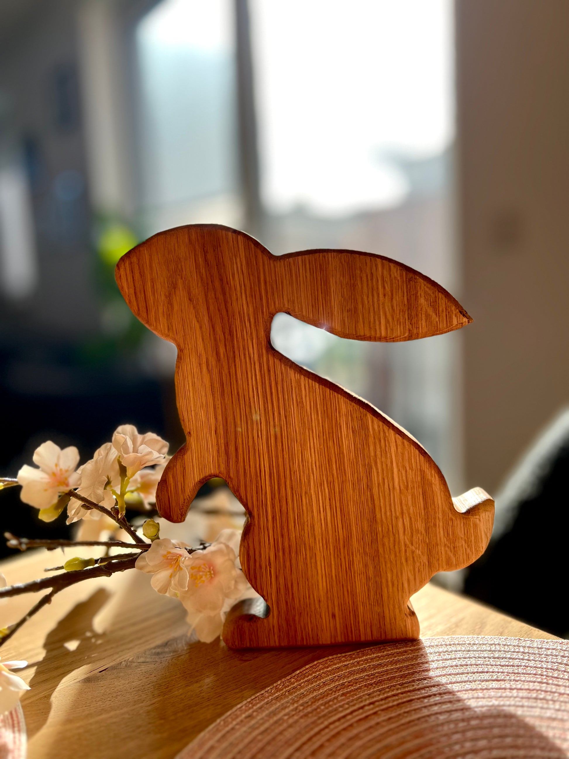 Holen Sie sich diese handgefertigte Osterhasenfigur aus Eichenholz und schaffen Sie eine festliche Atmosphäre in Ihrem Zuhause.